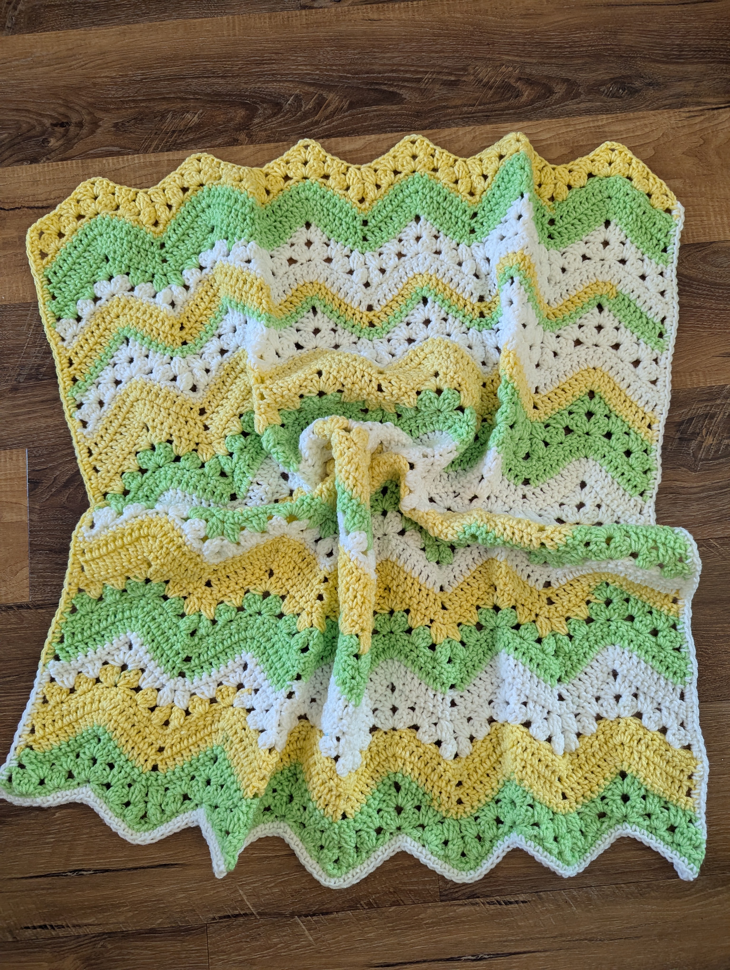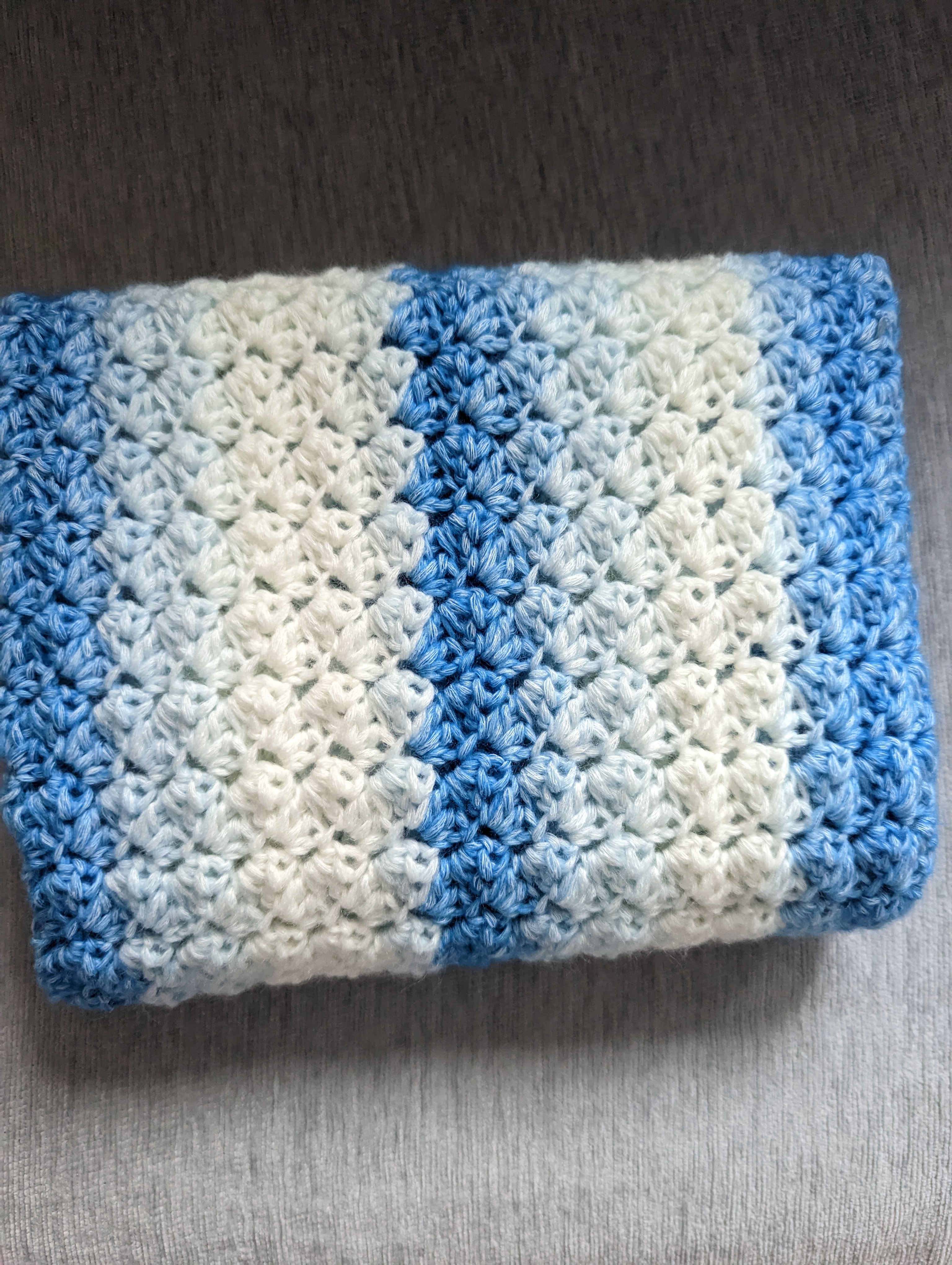 Made from top quality yarns, photos represent just a sampling of some of the blankets you may choose. Every blanket is made with the utmost care and lots of love added to surround and snuggle that special little one. Blankets are approximately 42-46″ in width/length.