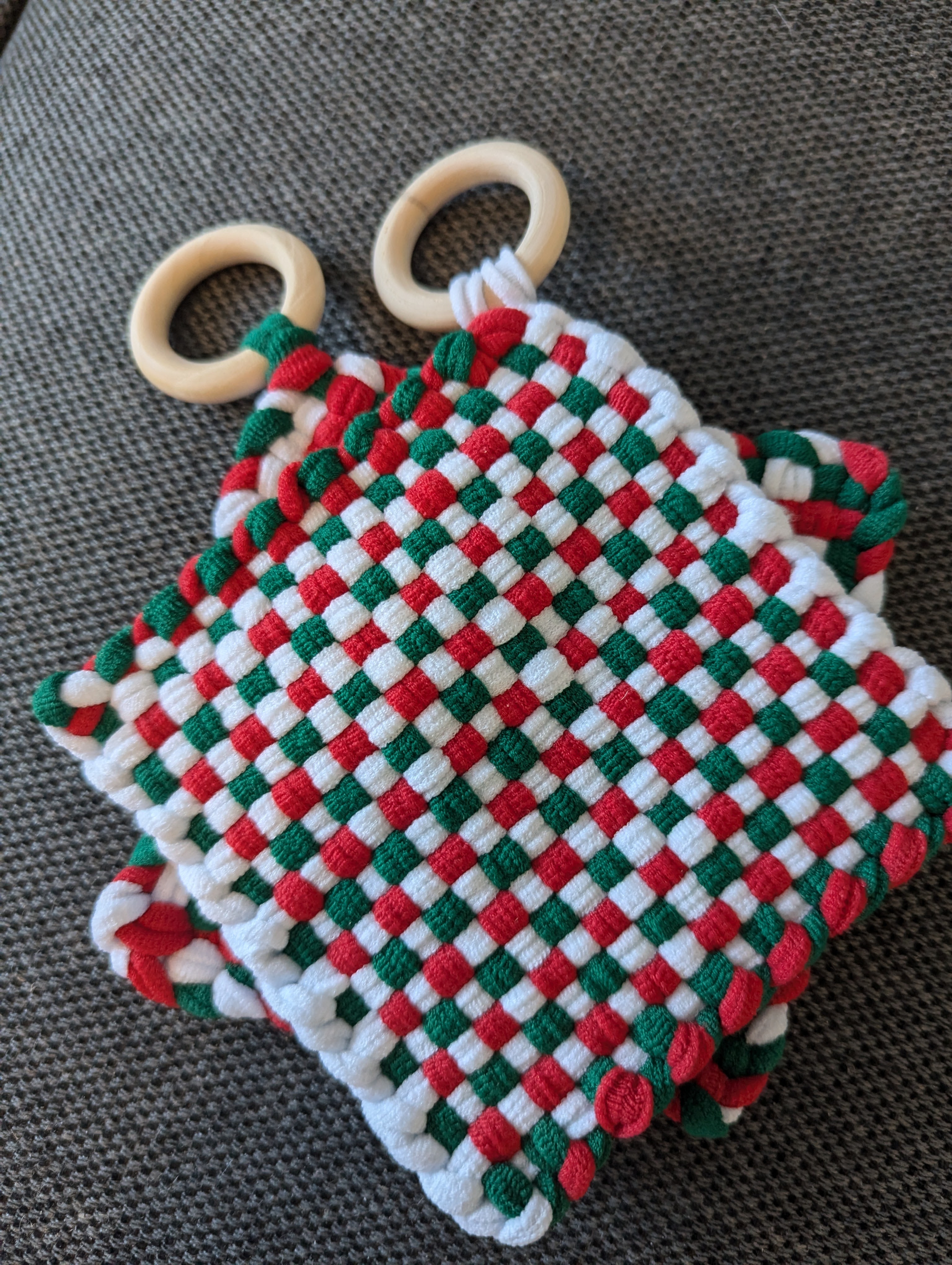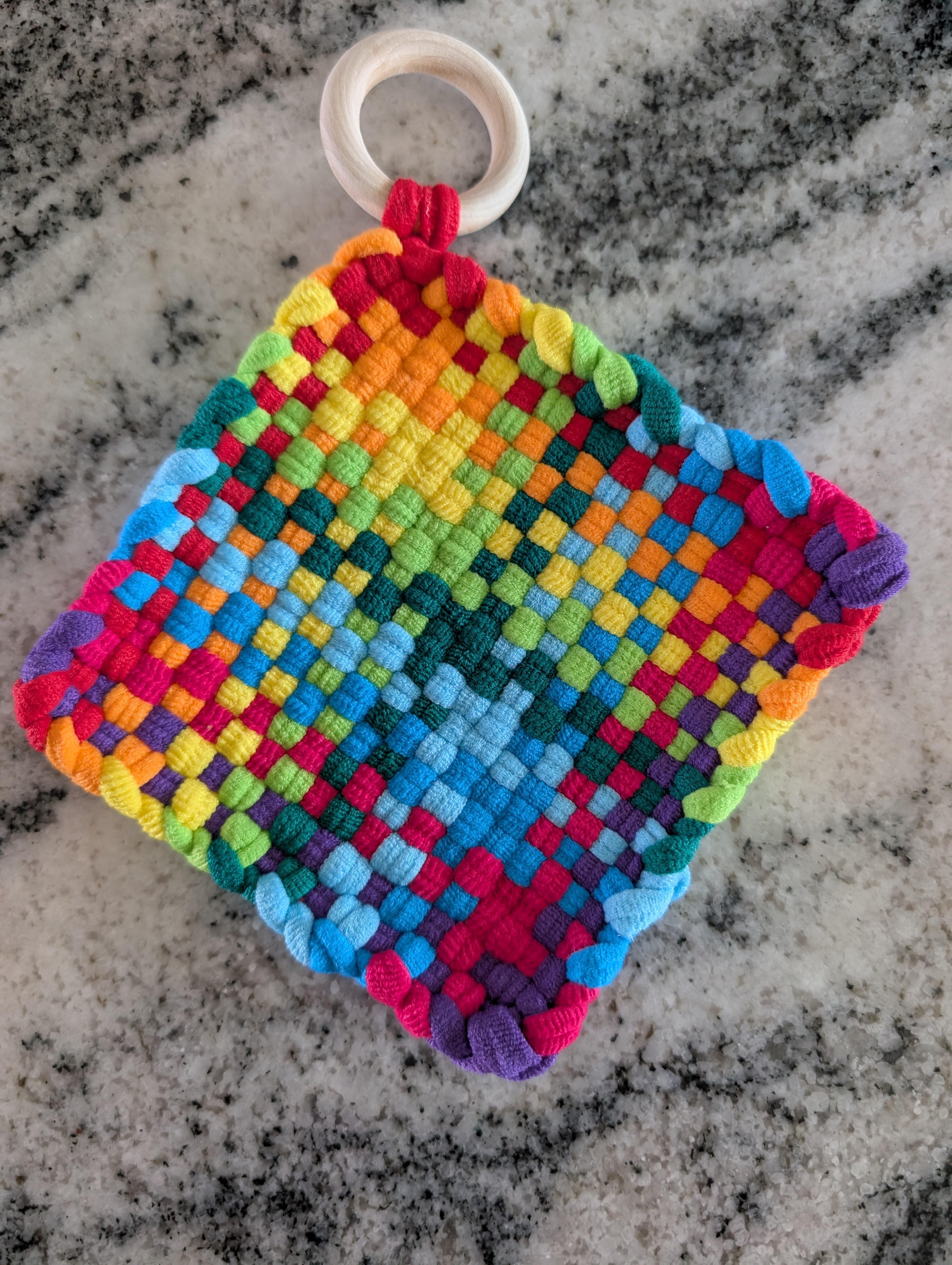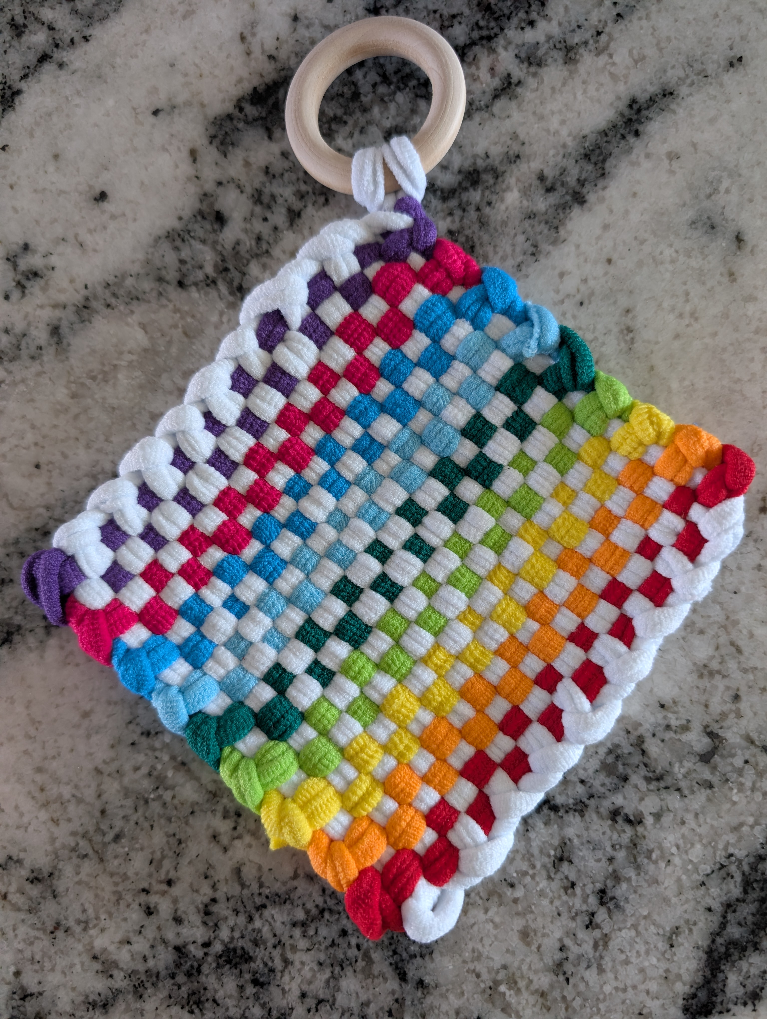 Made from textured polyester loops and assembled in colors as shown. Custom colors and patterns available upon request.