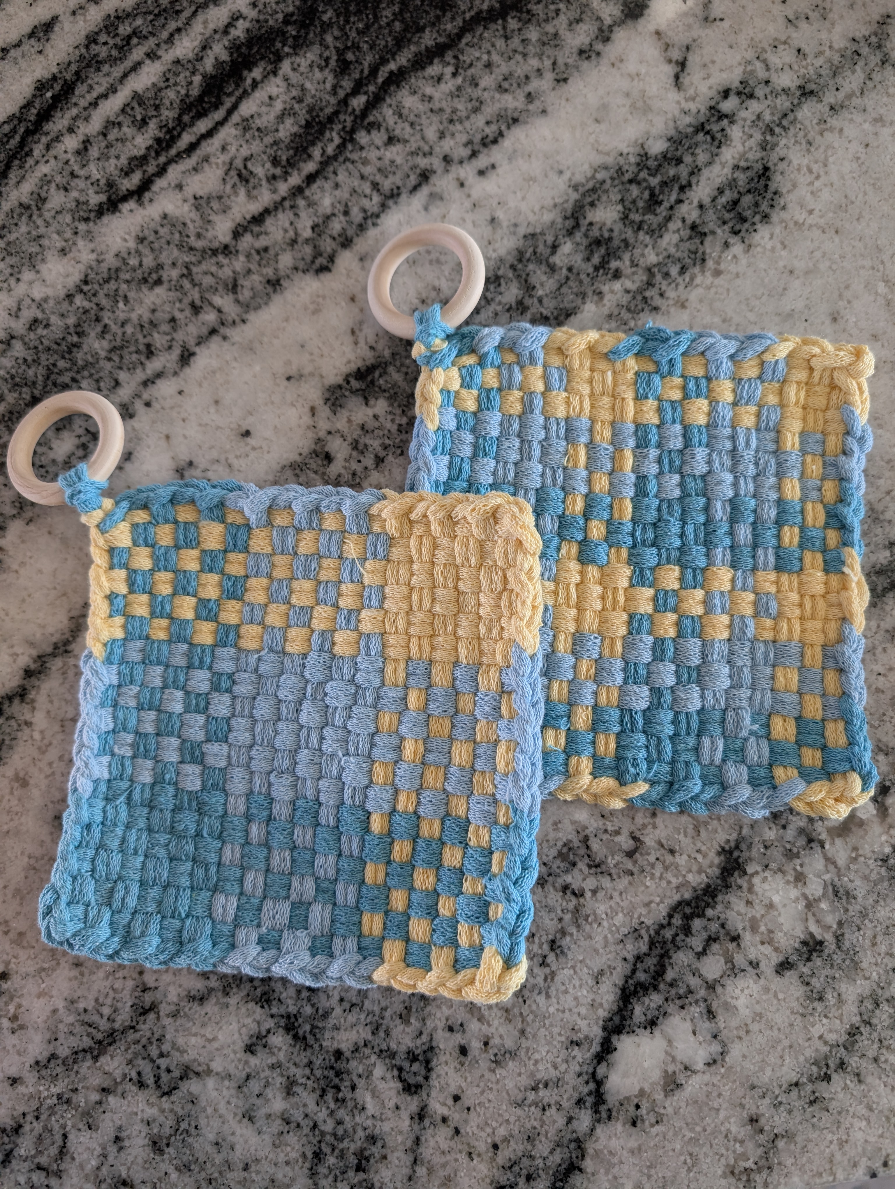 Made from textured cotton loops and assembled in colors as shown. Custom colors and patterns available upon request.